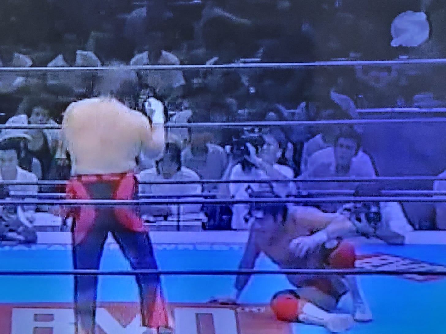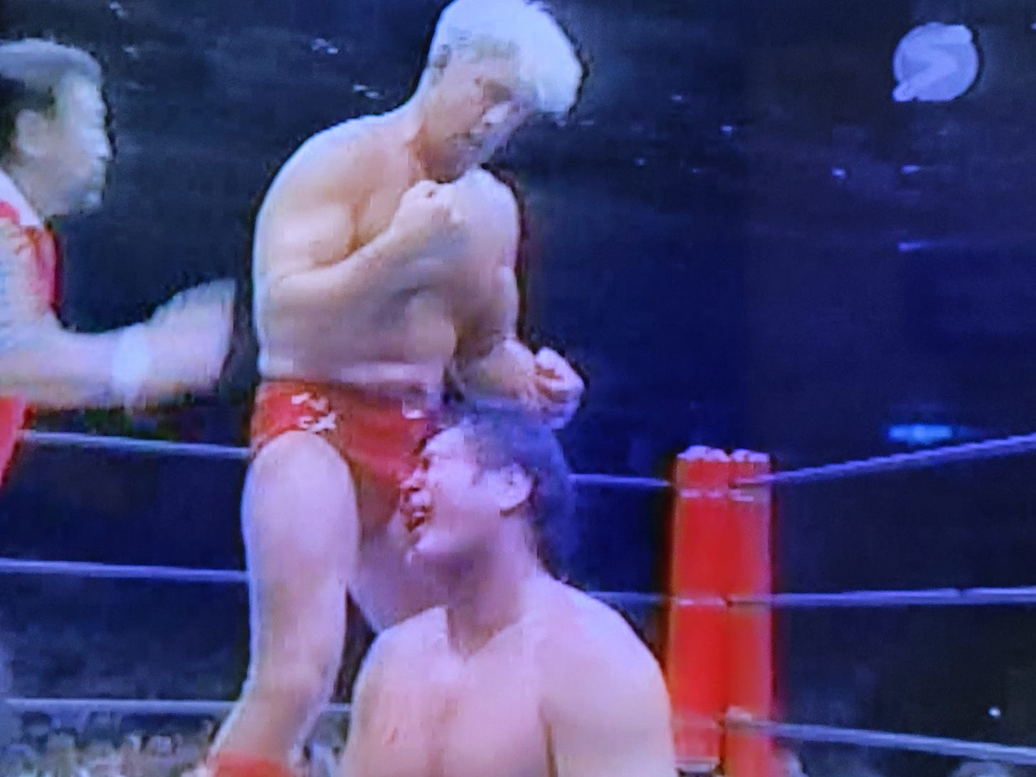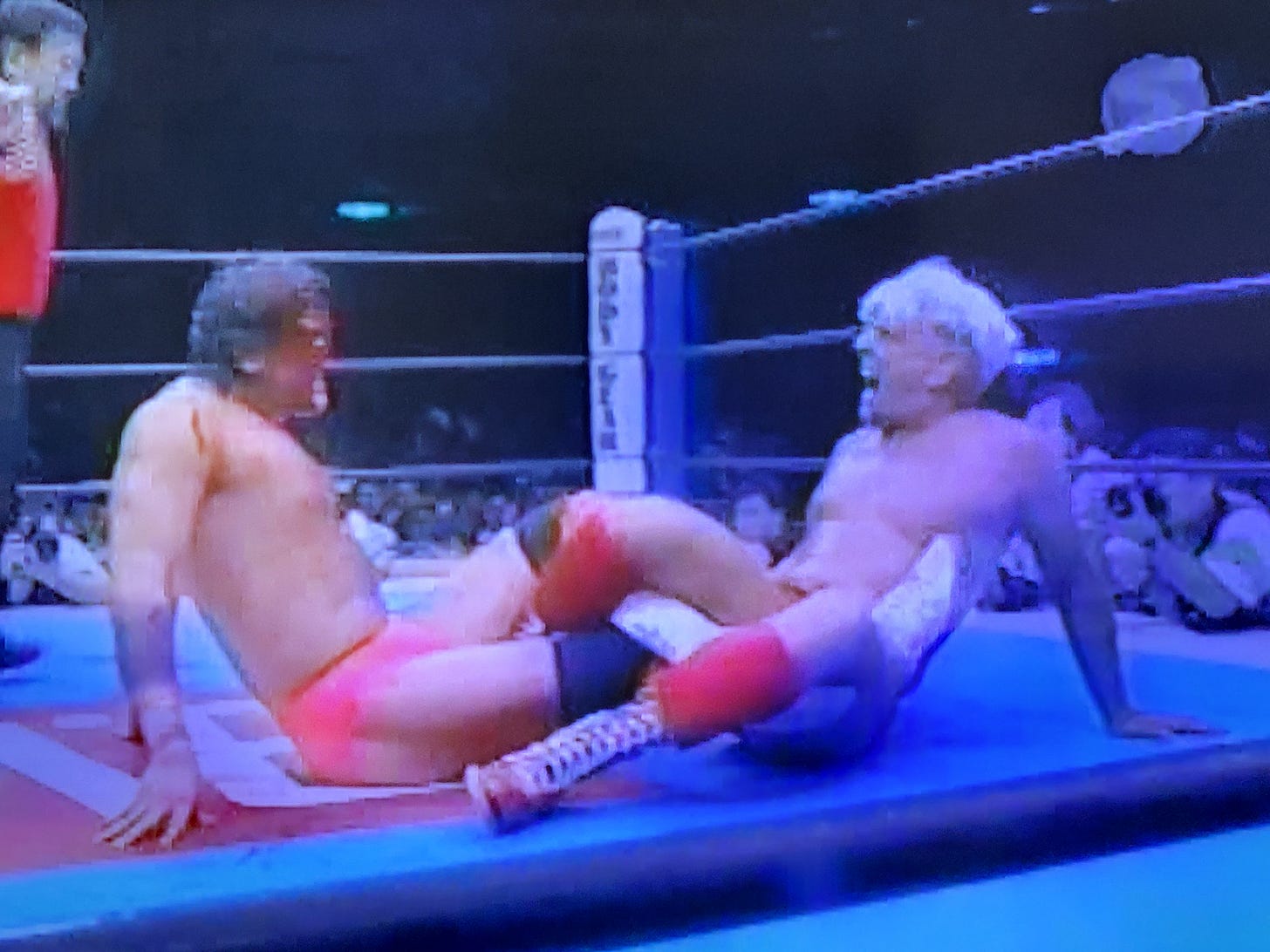 We join an A Block match, Ric Flair [3] vs. Keiji Muto [2], in progress. Flair goes for a top rope move, but instead of being thrown off as per usual, Muto meets him up there and suplexes him instead, causing Flair to scream in pain. The cut that Muto sustained in his prior match has reopened.