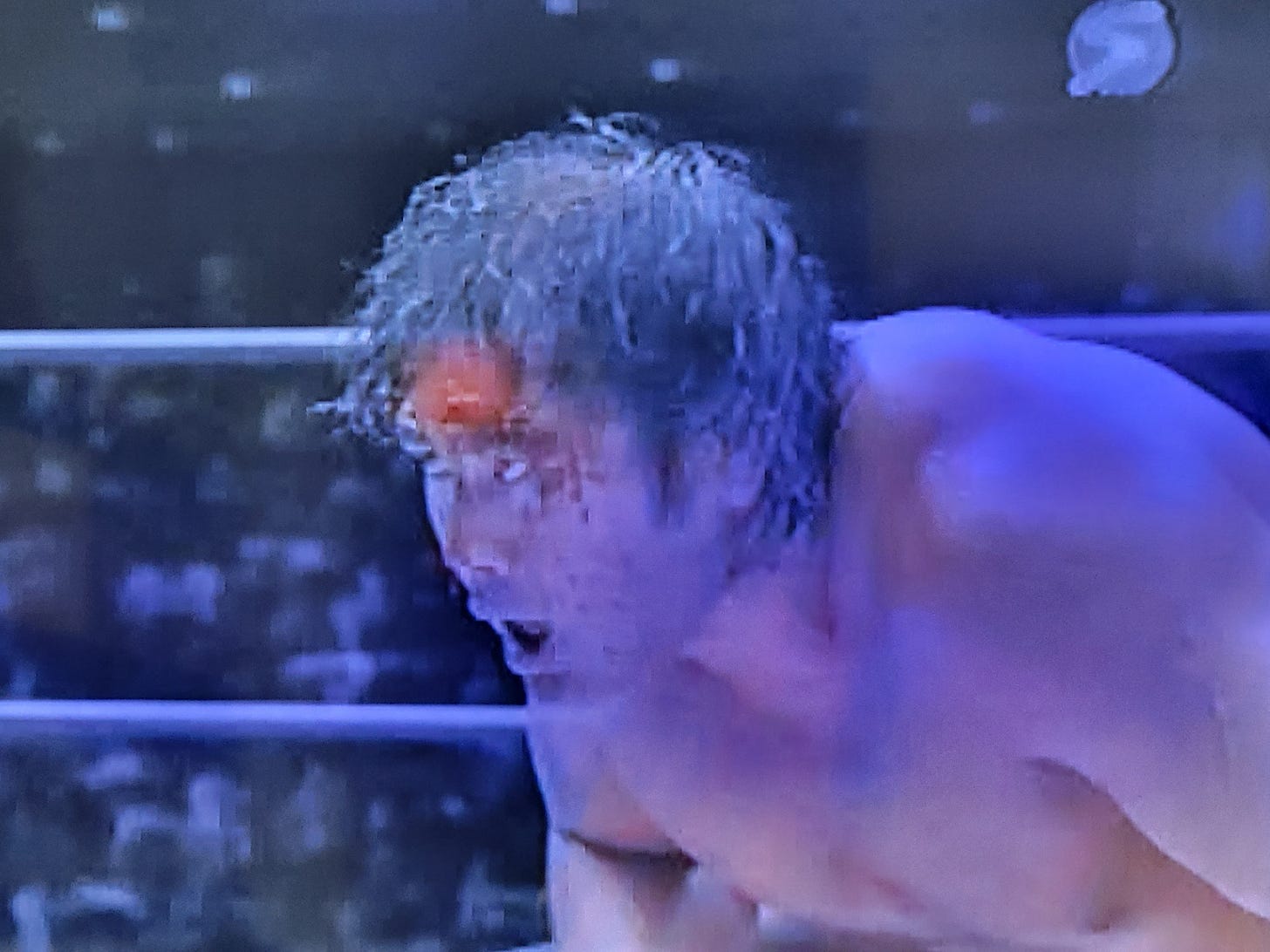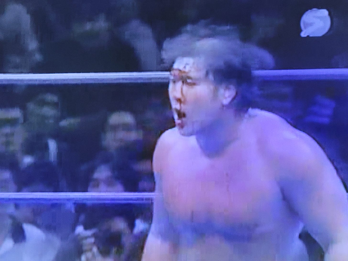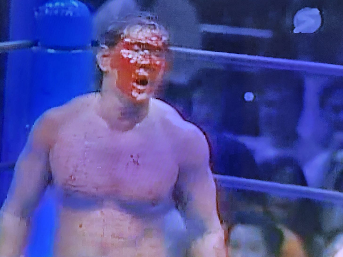 After some struggle, Muto reverses the hold. There's blood damn near everywhere as Muto reverses another Figure Four attempt with an inside cradle for two. Muto gets a backslide for two, and his forehead is just pissing the red stuff. Small package out of nowhere gets two for Muto, and he fires up after a Flair chop! Flair begs off! I don't blame him; I’d beg for my life if I had THIS looking back at me.